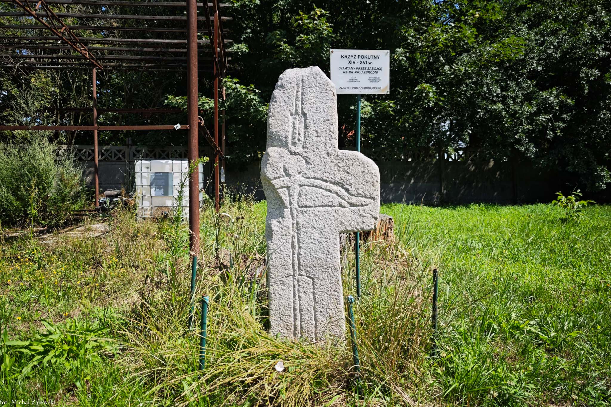 Granitowy krzyż na dziedzińcu firmy przy ul. Bocznej 14a (przed zbudowaniem palcu był to tył cmentarza kościelnego - krzyż stał przed jego murem). 50°43'43.0"N 17°50'58.3"E.