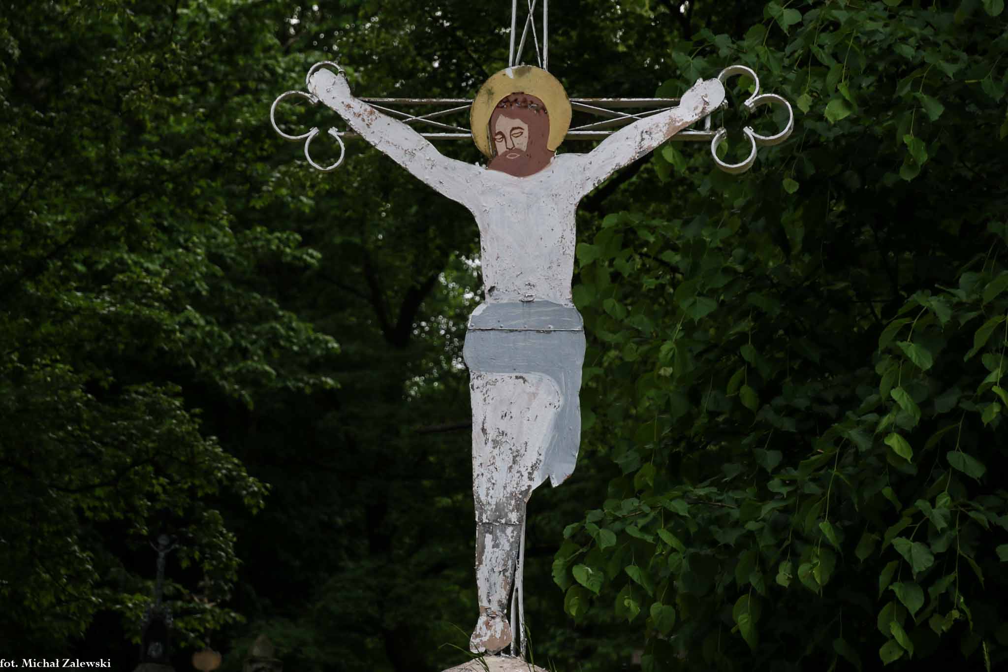 Besko, pow. sanocki. Krzyż z Chrystusem z blachy na cerkwisku w Besku (fot. 2022). Postać wysoka na ok. 175 cm. Łączona w pasie i kolanach.
