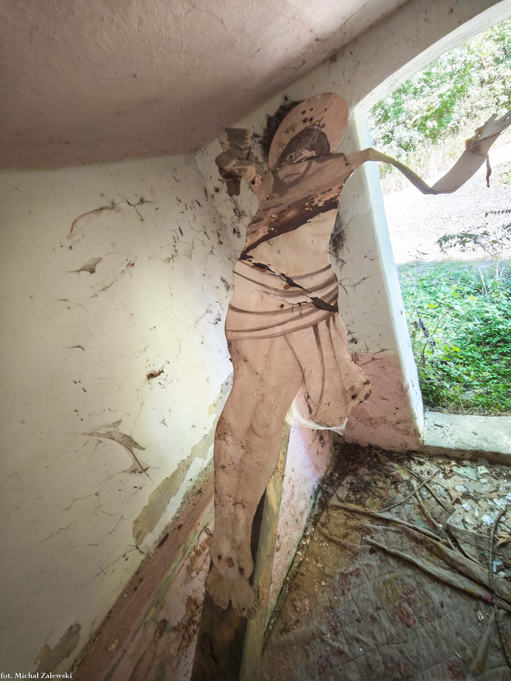 Chrystus z blachy z krzyża przydrożnego we wnętrzu kapliczki przydrożnej.