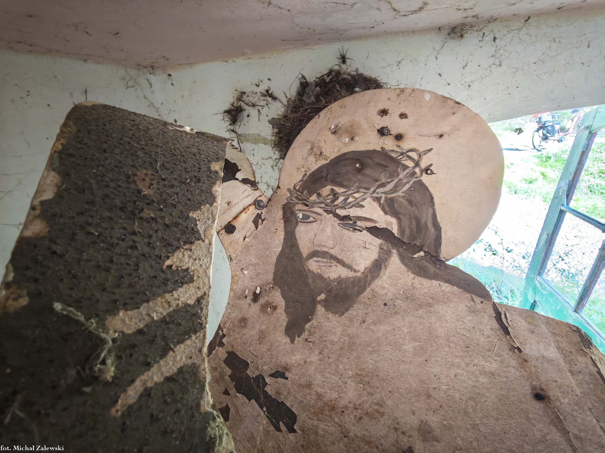 Chrystus z blachy z krzyża przydrożnego we wnętrzu kapliczki przydrożnej.