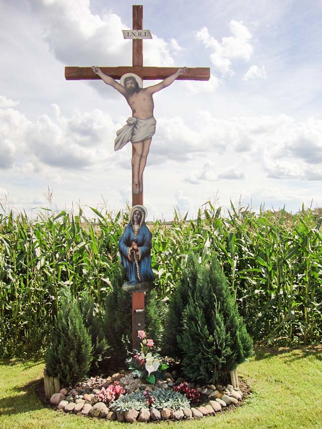 Krzyż z postaciami Chrystusa i Matki Boskiej Bolesnej wyciętymi z blachy. Fot. przed 2025.