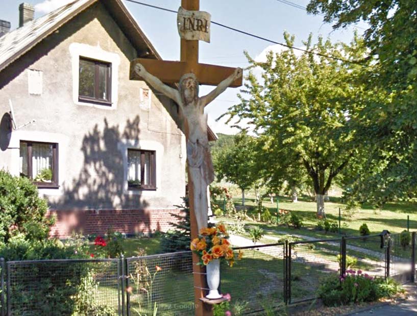 Krzyż z Chrystusem z blachy. Po 2019 r. blaszana postać zamieniona na postać ze sztucznego tworzywa.