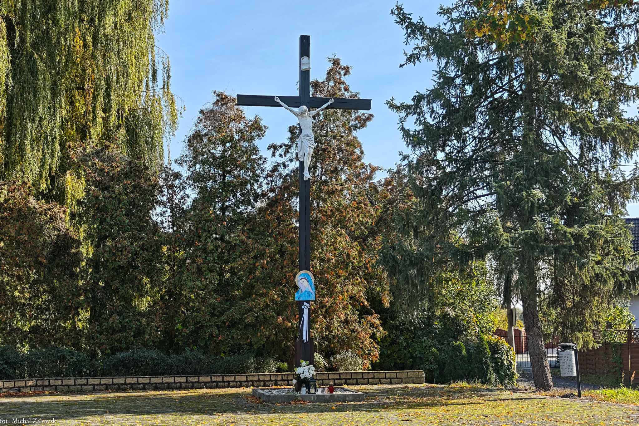 Opole Czarnowąsy. Drewniany krzyż na skrzyżowaniu ulic Wolności i Krzyżowej. Niegdyś była na nim postać Chrystusa z blachy. Blaszana pozostała Matka Boska. Fot. 2025.
