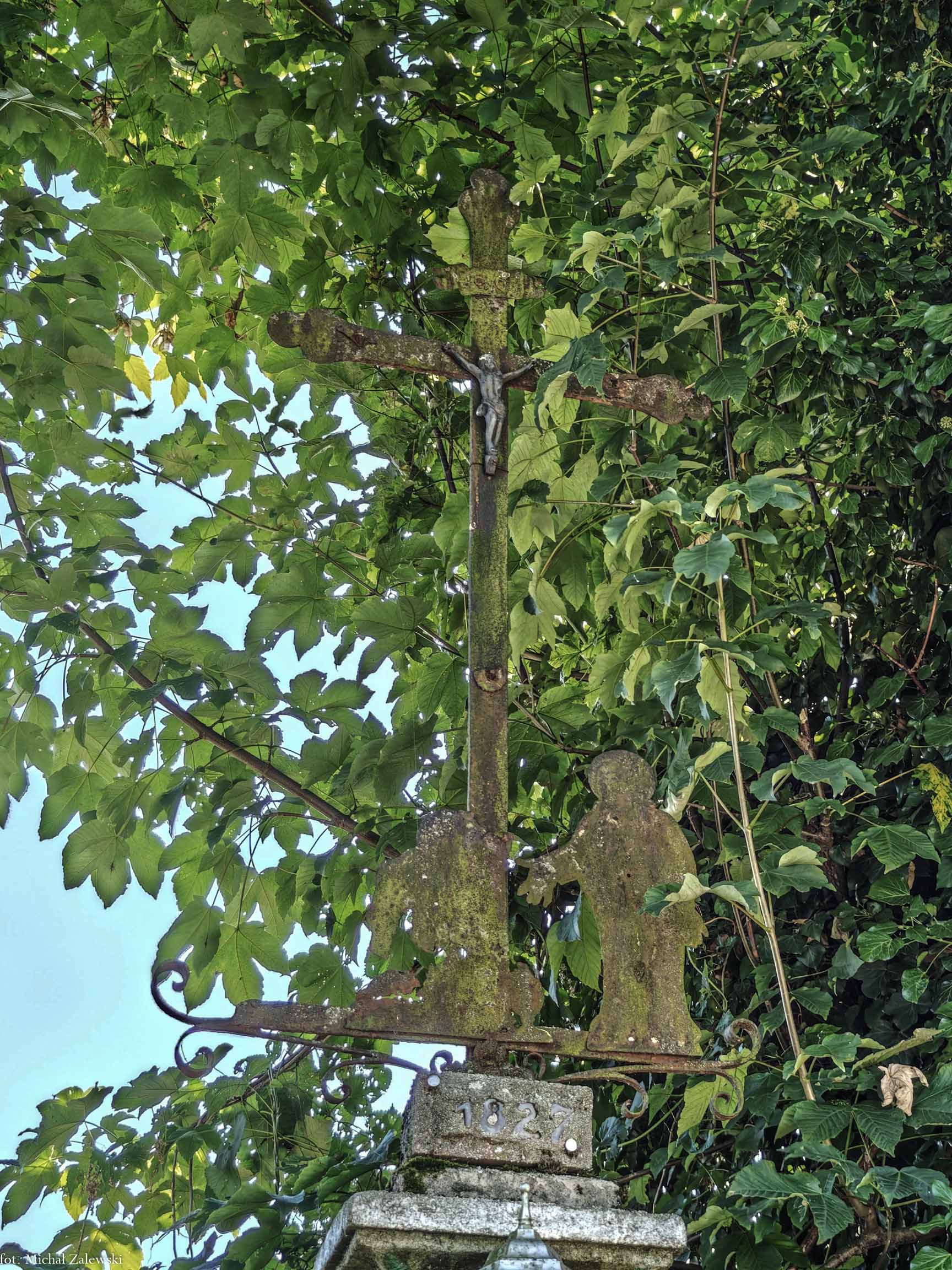 Krzyż metalowy na murowanym cokole. Grupa Ukrzyżowania z blachy. Pozostałości. Brak Chrystusa. Data na cokole 1827.