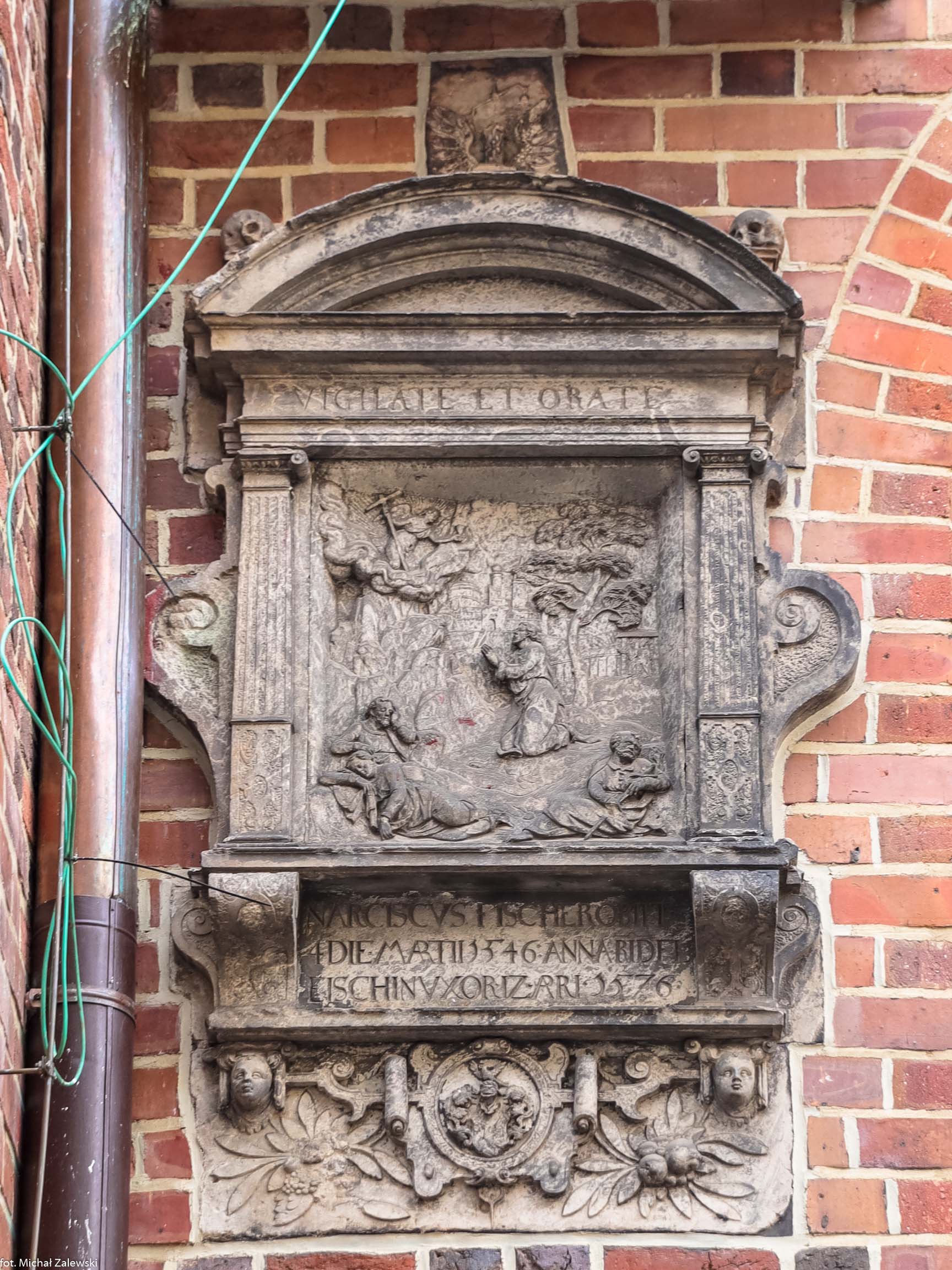 Nagrobek Narcisa Fischera († 1546) i jego małżonki Anny Rindfleisch († 1576), piękne dzieło z misternie wyrzeźbionymi głowami, w stylu wysokiego renesansu (6 × 4 stopy). Pośrodku relief: Chrystus na Górze Oliwnej. Nad nim napis: „Vigilate et orate” (Czuwajcie i módlcie się); pod nim inskrypcja: „Narcissus Fischer zmarł 4 marca 1546; Anna Rindfleisch, małżonka, 12 kwietnia roku 1576.” Na samym dole herb rodu Fischerów.