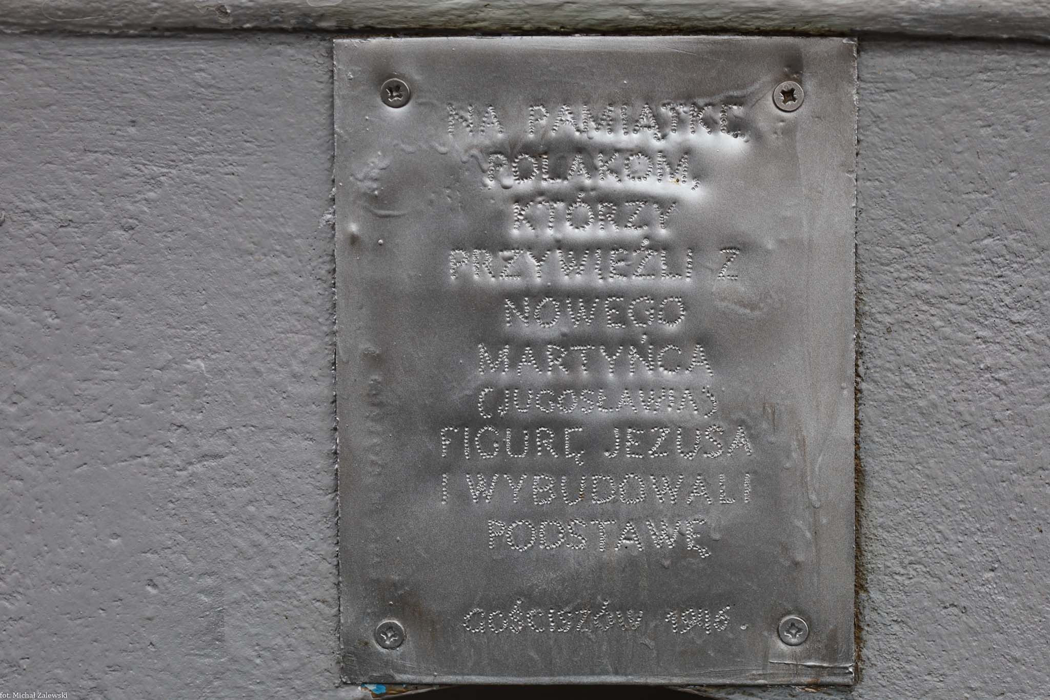 Inskrypcja na kapliczce: Na pamiątkę Polakom którzy przywieźli z Nowego Martyńca (Jugosławia) figurę Jezusa i wybudowali podstawę. Gościszów 1946.