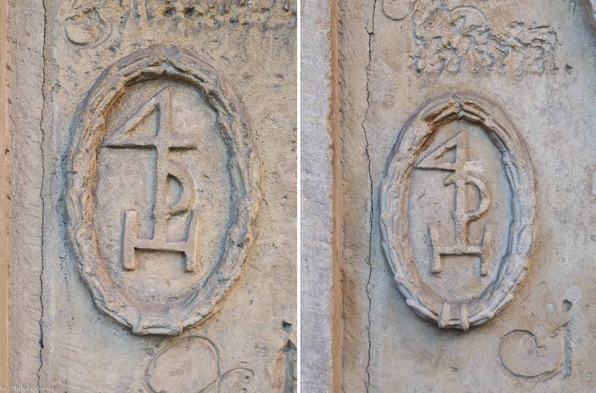 Gmerk (Hausmarke) sukiennika Davida Hermanna na płycie pamiątkowej cechu sukienników i jej kopii (1713) Fot. 2019.