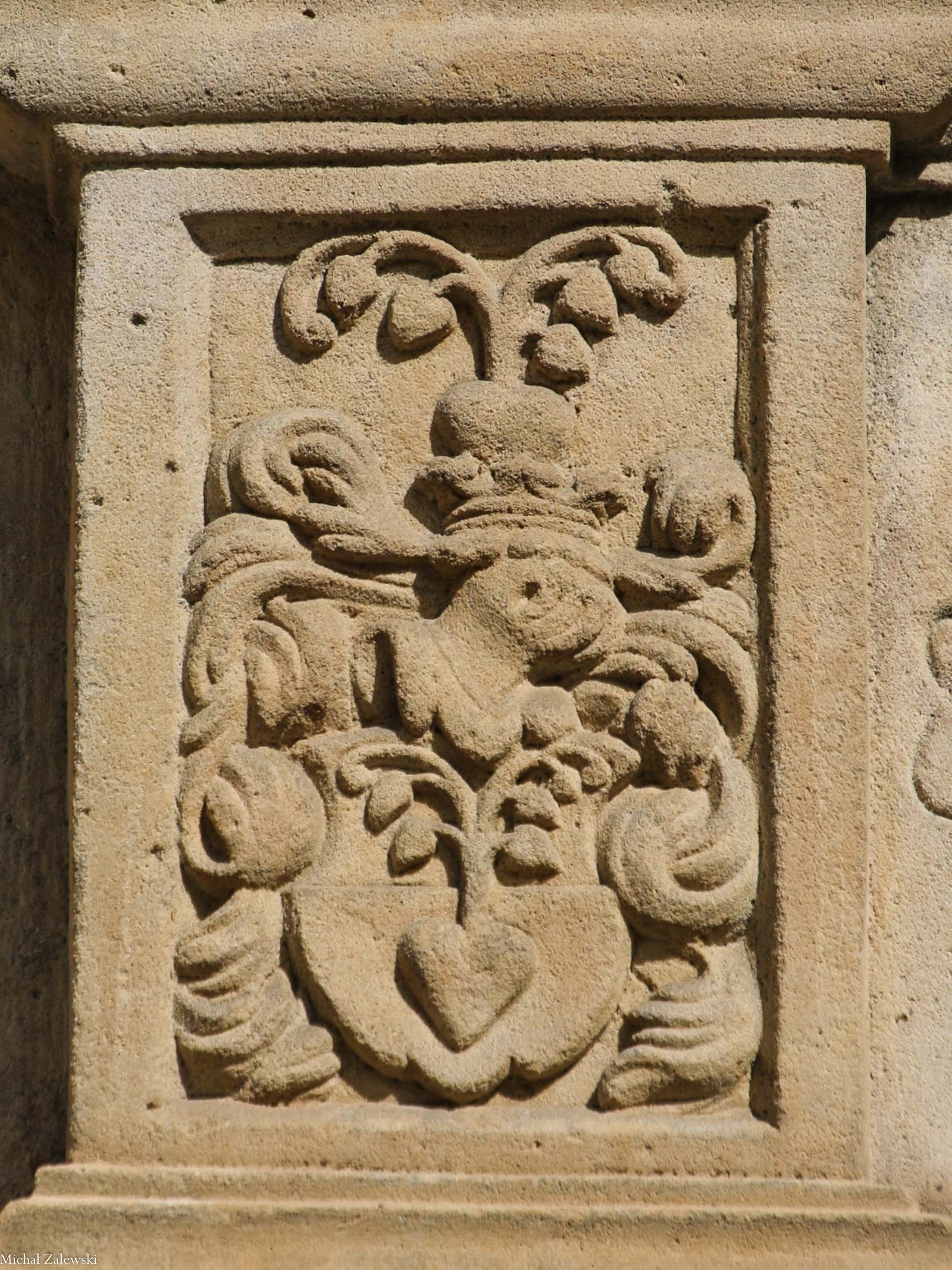 Herb Hansa Hertwiga (zm. 1575) na jego epitafium na południowej fasadzie fary elżbietańskiej. Fot. 2024.