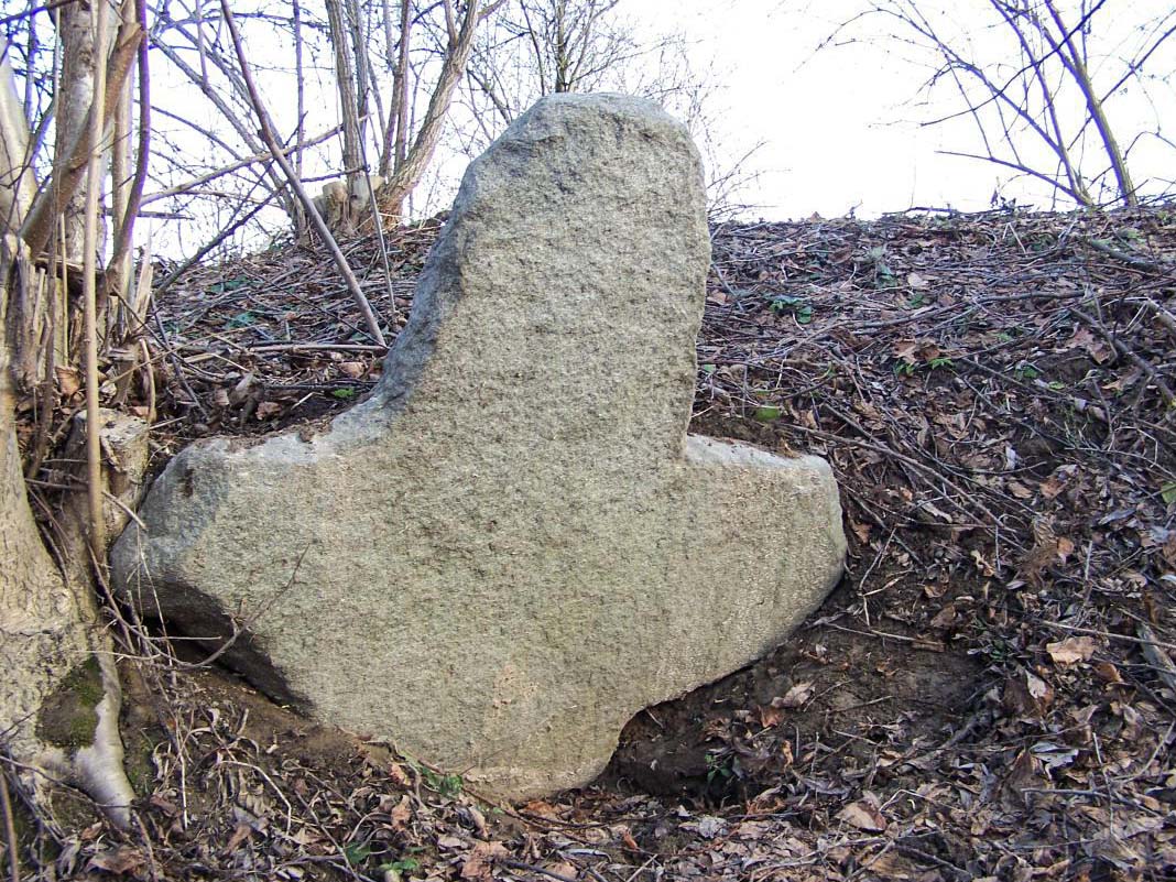 Nieociosany kamień. Leży ukryty w zaroślach na wysokiej skarpie rowu.