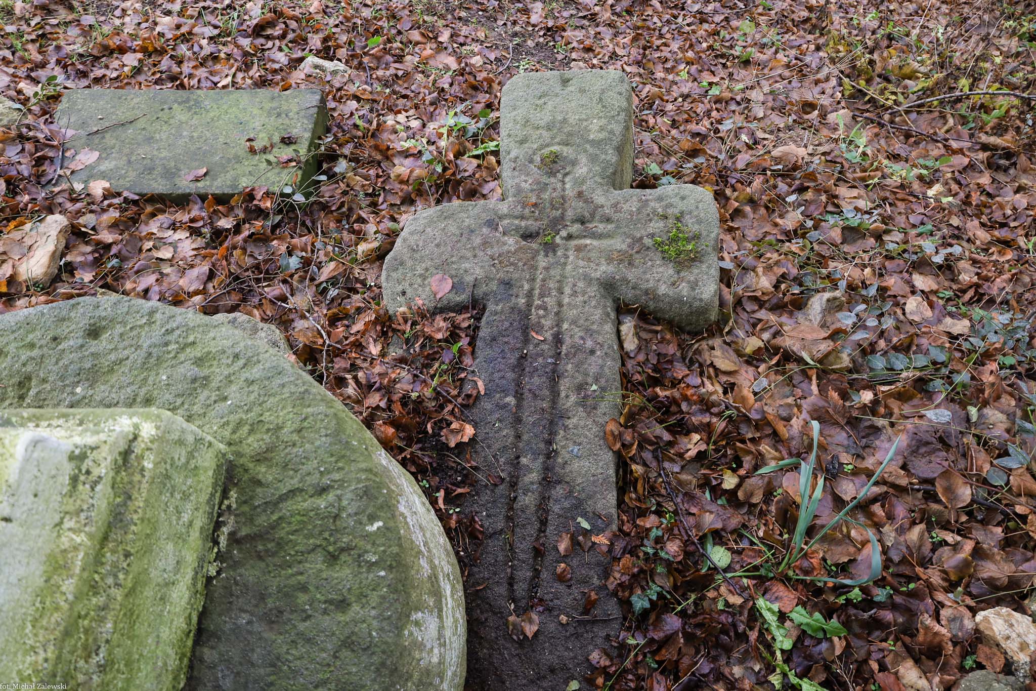 Krzyż ze zlepieńca, leżący pod kołem młyńskim na wschód od bramki wejściowej na cmentarz kościelny. Ryt miecza.