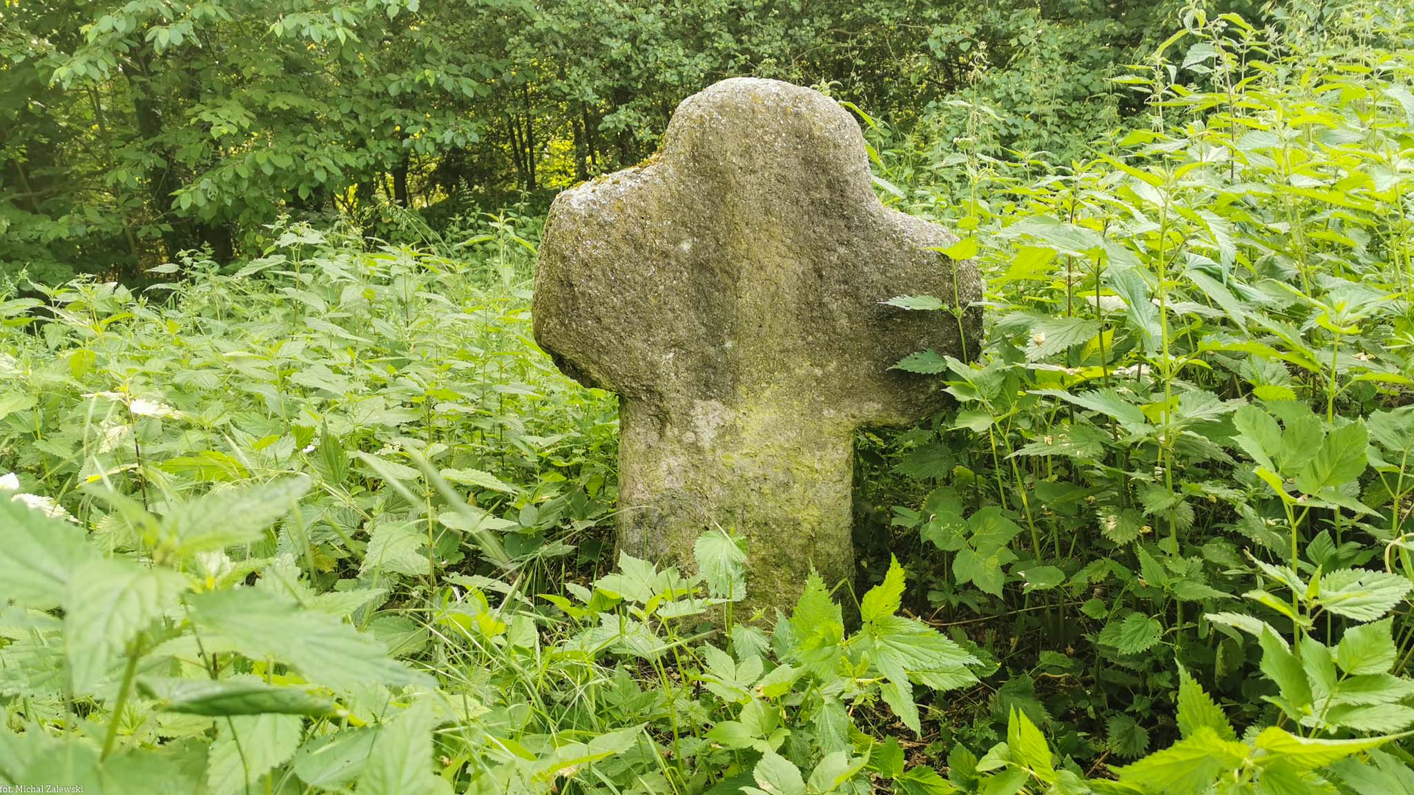 Krzyż ze zlepieńca na rozwidleniu polnych dróg. Południowy skraj wsi, droga za domem 33.