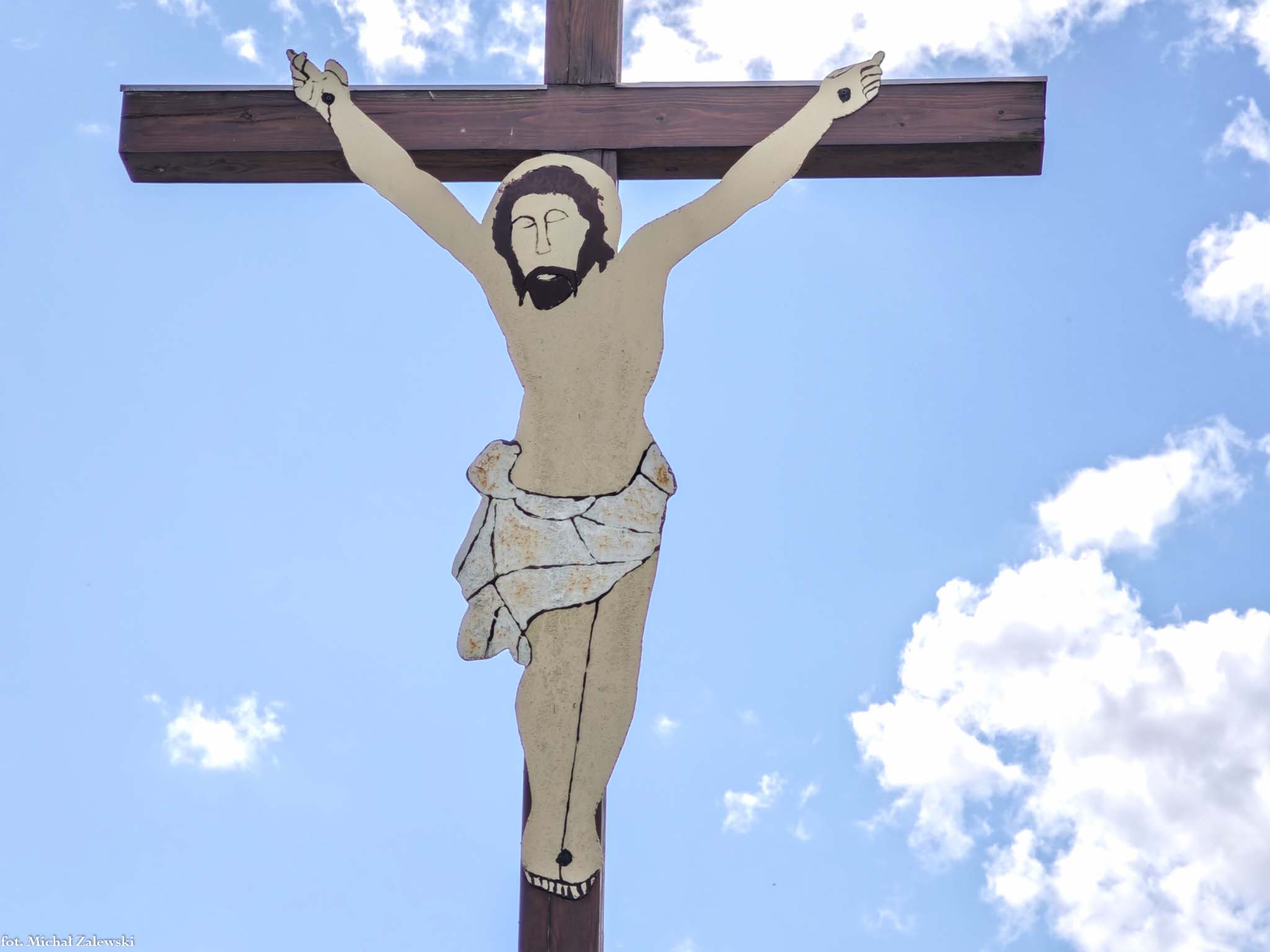 Krzyż z Chrystusem z blachy za wsią przy drodze do Białej.