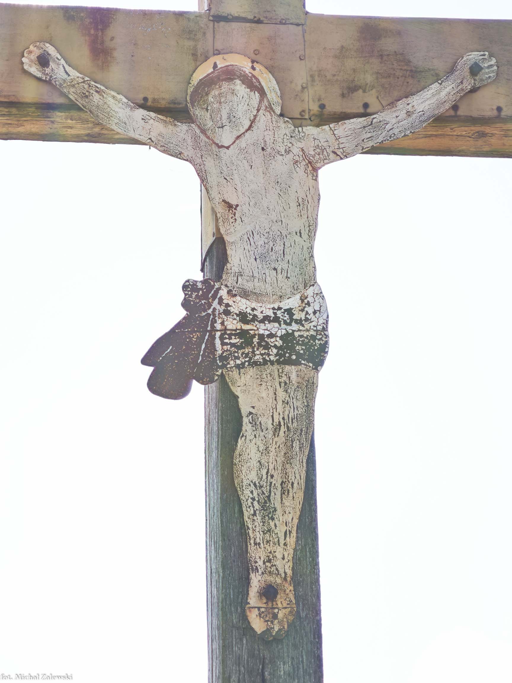 Krzyż z Chrystusem z blachy przy polnej drodze na zachód od wsi.