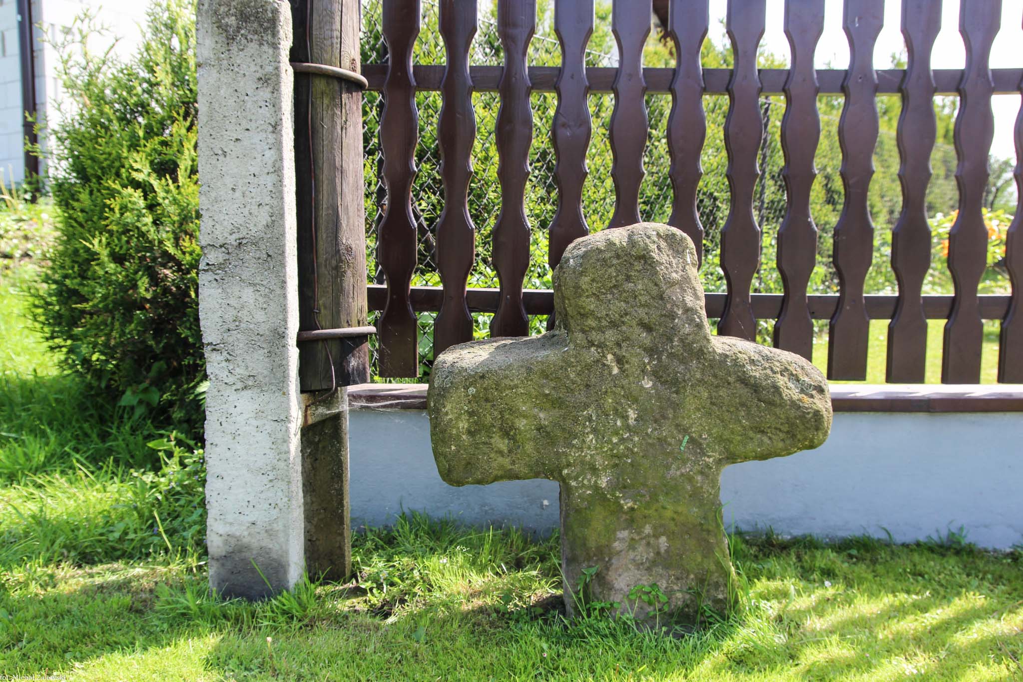 Krzyż z piaskowca po południowej stronie ulicy Dworcowej, koło ogrodzenia posesji nr 5. 49°56'53.4"N 18°20'21.6"E.
