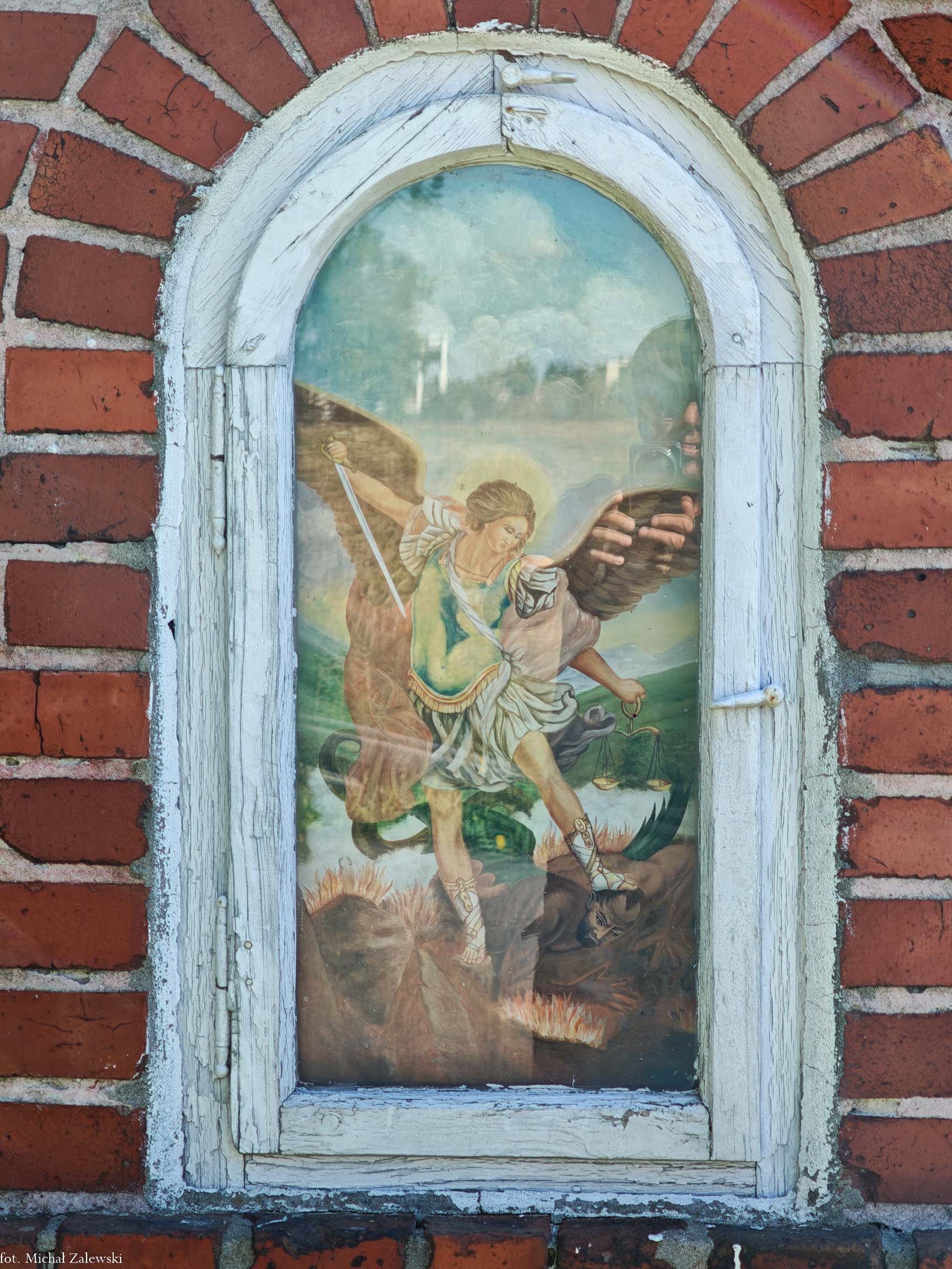 Archanioł Michał. Jeden z obrazów na blasze we wnękach kapliczki przydrożnej (XIX/XX w.). Opole Półwsie, ul. Partyzancka. Fot. 2025.