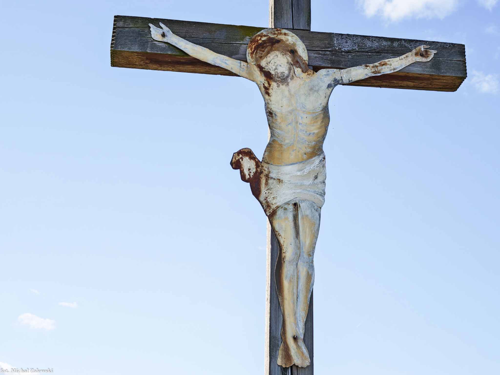 Krzyż z Chrystusem z blachy przy polnej drodze równoległej do wsi na SW od niej.