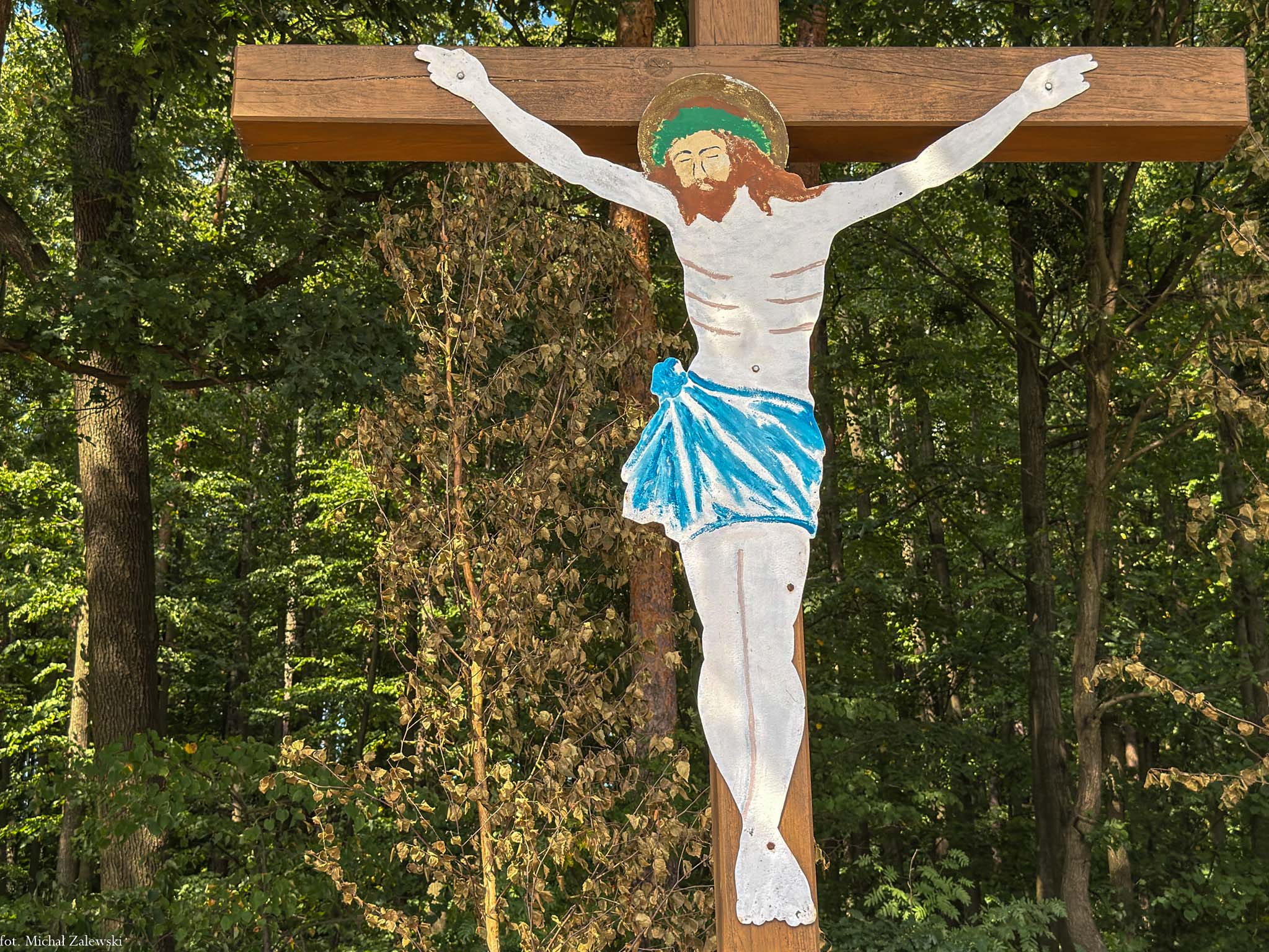 Krzyż z Chrystusem z blachy przy drodze w kierunku Strzegowa.