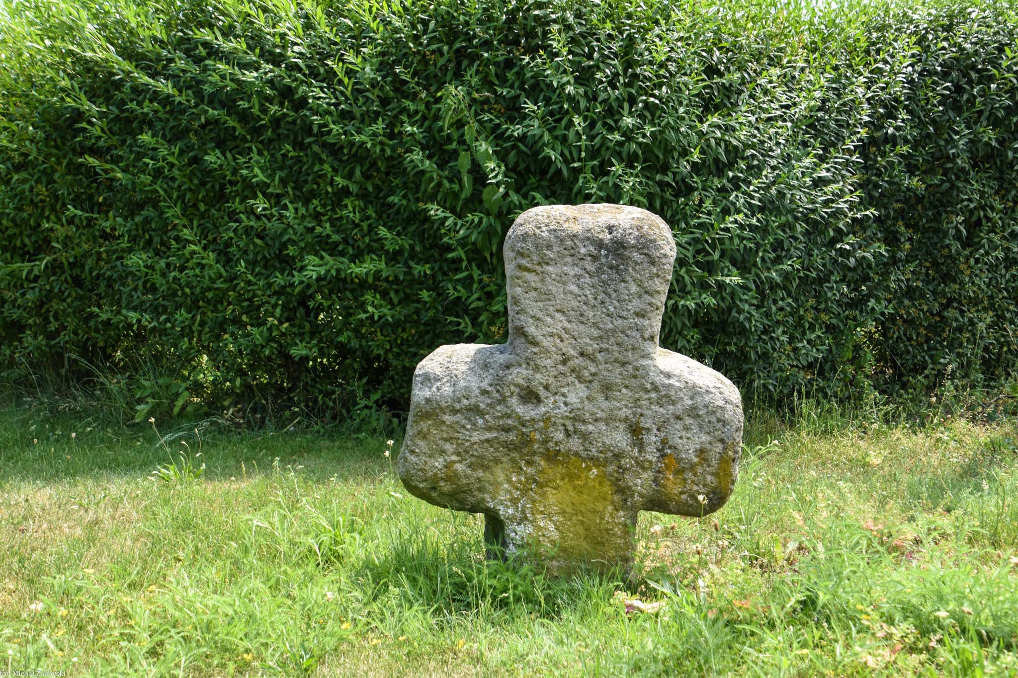 Piaskowcowy krzyż w okolicy posesji nr 3, niecałe 200 m na wschód od kościoła. 51°14'33.2"N 16°33'26.5"E.