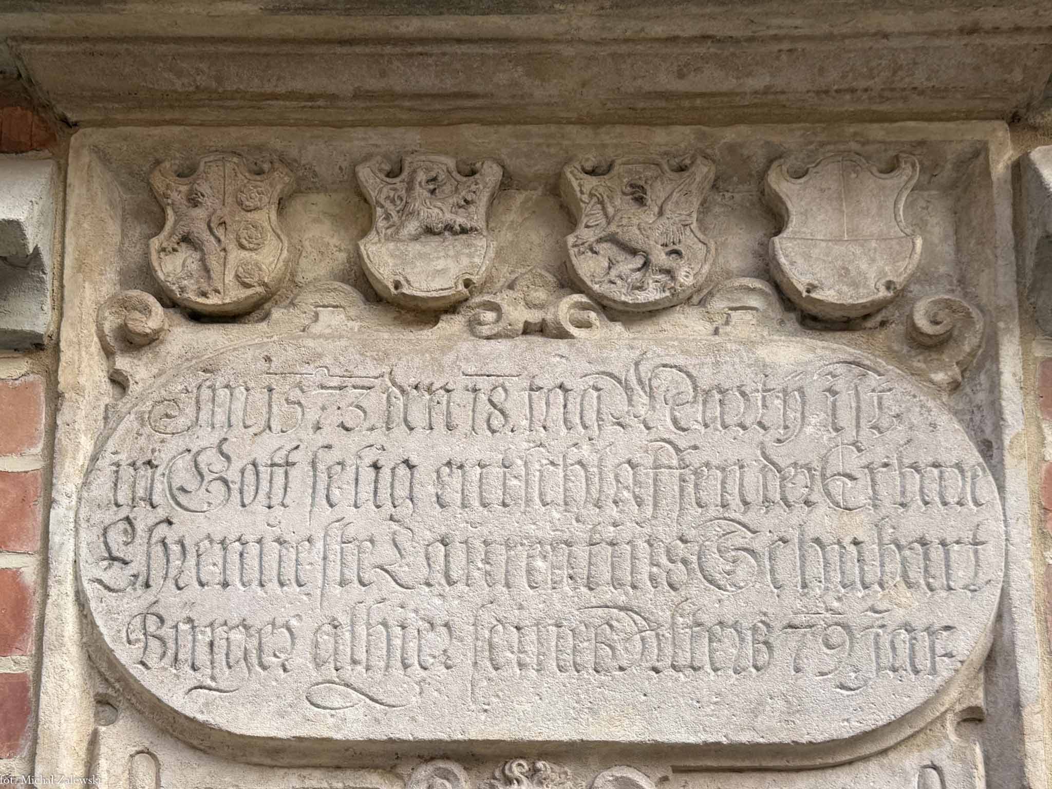 Epitafium Lorenza Schubarta (zm.) i jego małżonki Anny, z domu Althof. Północna fasada fary elżbietańskiej we Wrocławiu. Fot. 2025.