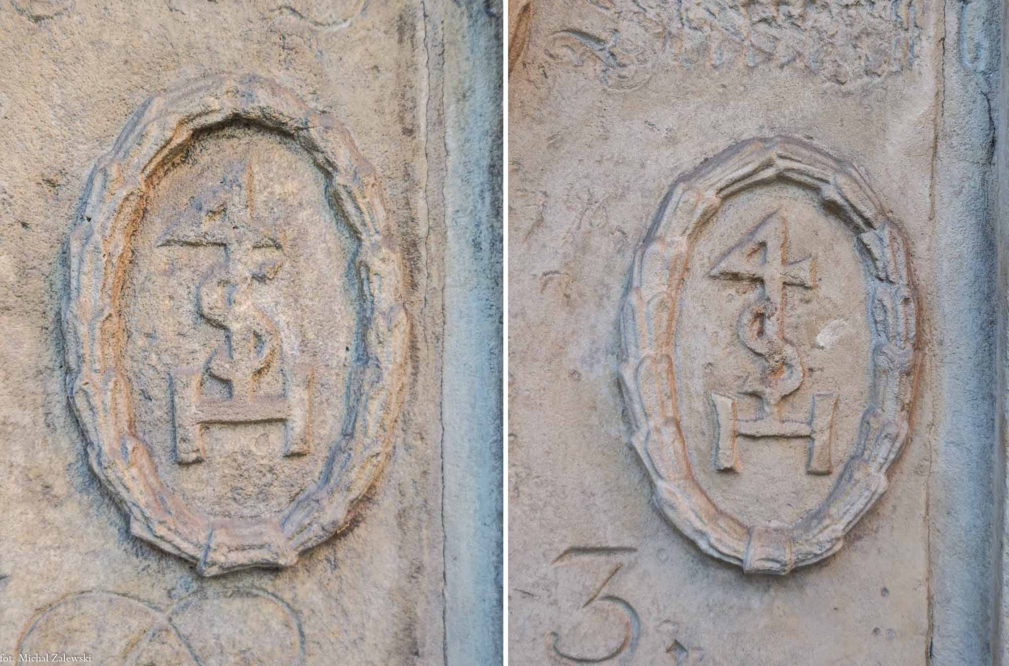 Gmerk (Hausmarke) sukiennika Johanna Straussa na płycie pamiątkowej cechu sukienników i jej kopii (1713) Fot. 2019.