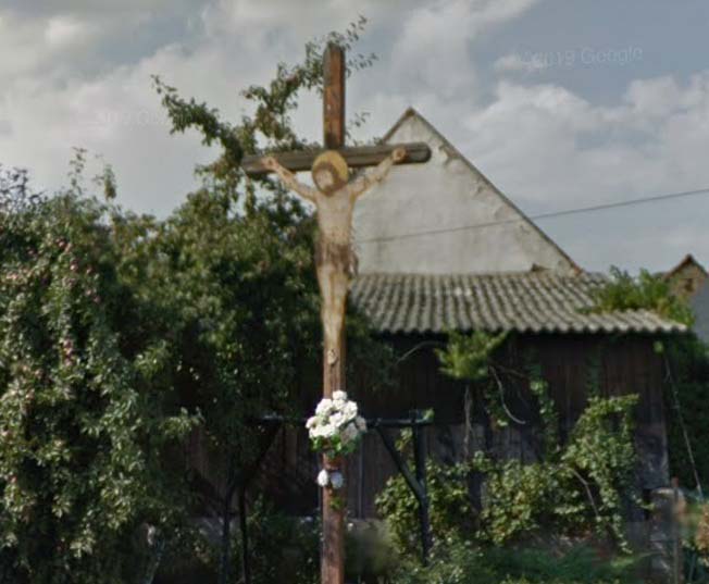 Krzyż przy głównej ulicy w okolicy posesji nr 37. W 2023 r. nie było już na nim Chrystusa z blachy.