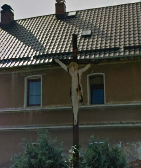 Krzyż przy głównej ulicy w okolicy posesji nr 37. W 2023 r. nie było już na nim Chrystusa z blachy.