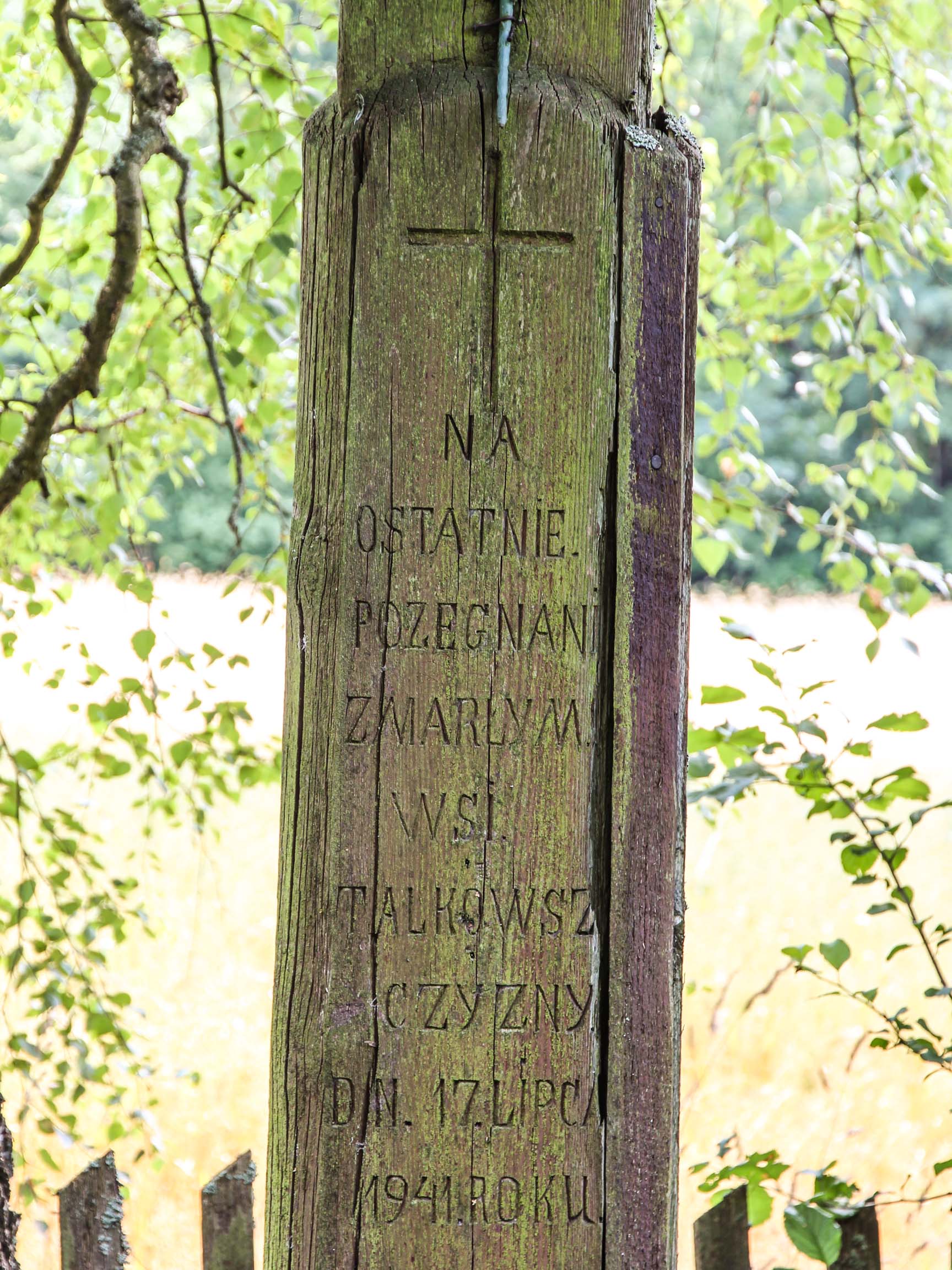 Inskrypcja na krzyżu pożegnalnym, za wsią w kierunku wschodnim w stronę kościoła w Szudziałowie.