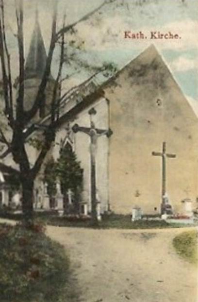 Krzyż z Chrystusem z blachy (na lewo od kościoła, czyli na południowy wschód od budynku katolickiego kościoła pw. św. Jadwigi) widoczny na pocztówce wysłanej w 1914 r. (zdjęcie to fragment pocztówki z różnymi widokami wsi).
