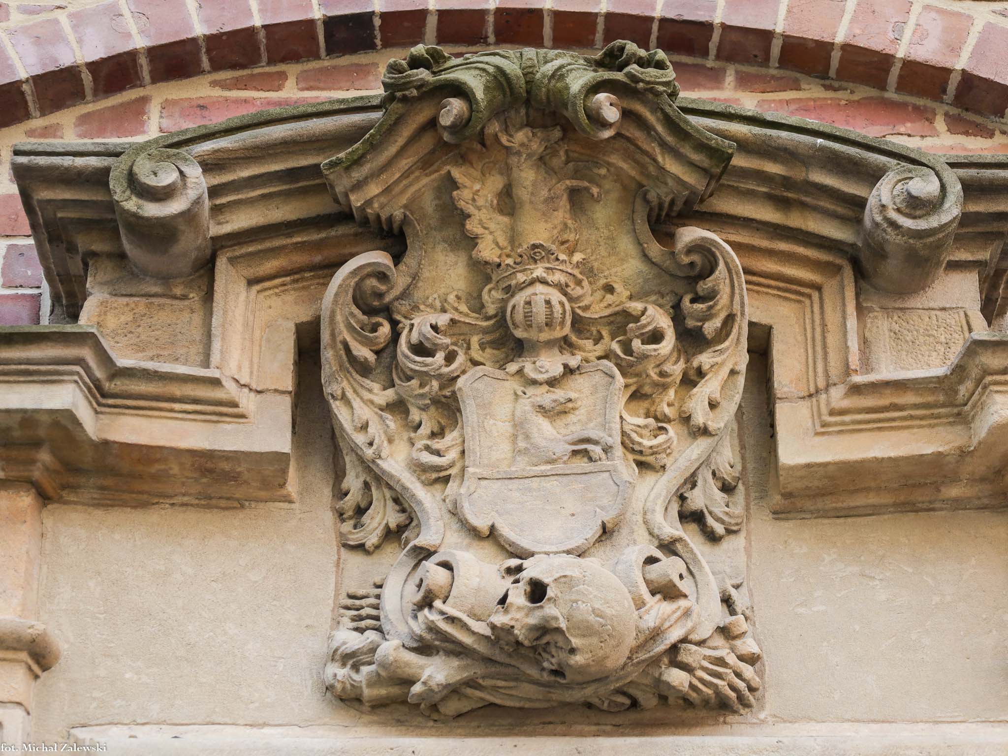 Herb rodziny Wolff w zwieńczeniu portalu wejściowego do zakrystii. Fara elżbietańska we Wrocławiu. Fot. 2025