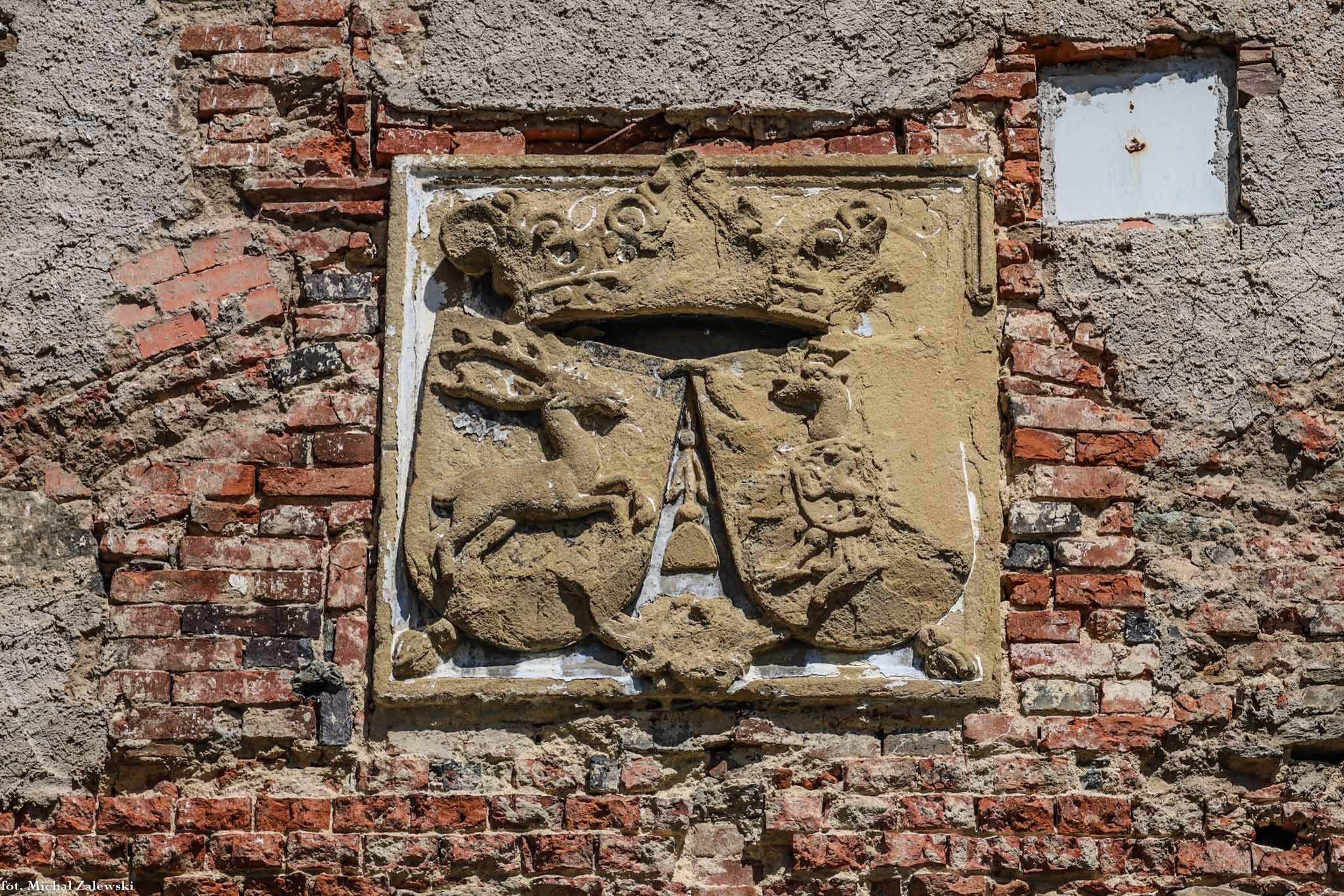 Herb małżeński Matthiasa Gottfrieda von Wunschwitz z Anną Felicianą Pachta von Rajov na wschodniej ścianie zamku w Poběžovicach. Fot. 2025.