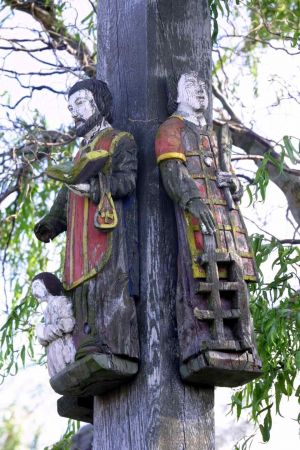 Na tym samym poziomie na bocznych ściankach pionowej belki krzyża stoją dwaj święci. Po prawej ręce św. Walentego znajduje się rzeźba św. Jana Ewangelisty[uwaga 3]. Najmłodszy Apostoł, towarzyszący Maryi pod krzyżem na Golgocie, przedstawiony jest jako młody mężczyzna w czerwonej sukni i zielonym płaszczu, przyciskający lewą dłoń do piersi. Z lewej strony św. Walentego stoi szczególnie upodobany przez Wielkopolan jako patron kapliczek św. Wawrzyniec. Ukazany jest zgodnie z kanonem jako diakon w stroju liturgicznym - czerwonej dalmatyce założonej na albę. Jego przedstawienie uzupełniają przynależne mu atrybuty: zielona palma męczeństwa trzymana w lewej ręce i ruszt (krata), na którym miał przypiekany ponieść męczeńską śmierć, z opartą na niej prawą dłonią świętego.