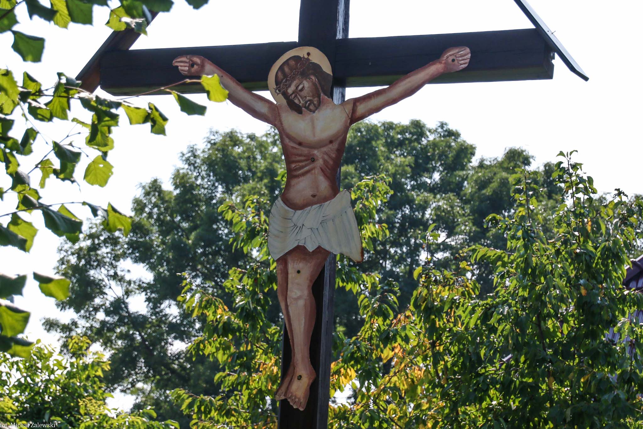 Stary Wiązów (niem. Alt Wansen) gm. Wiązów, pow. strzeliński, woj. dolnośląskie. Krzyż przydrożny z Chrystusem wyciętym z blach. Fot. 2023.