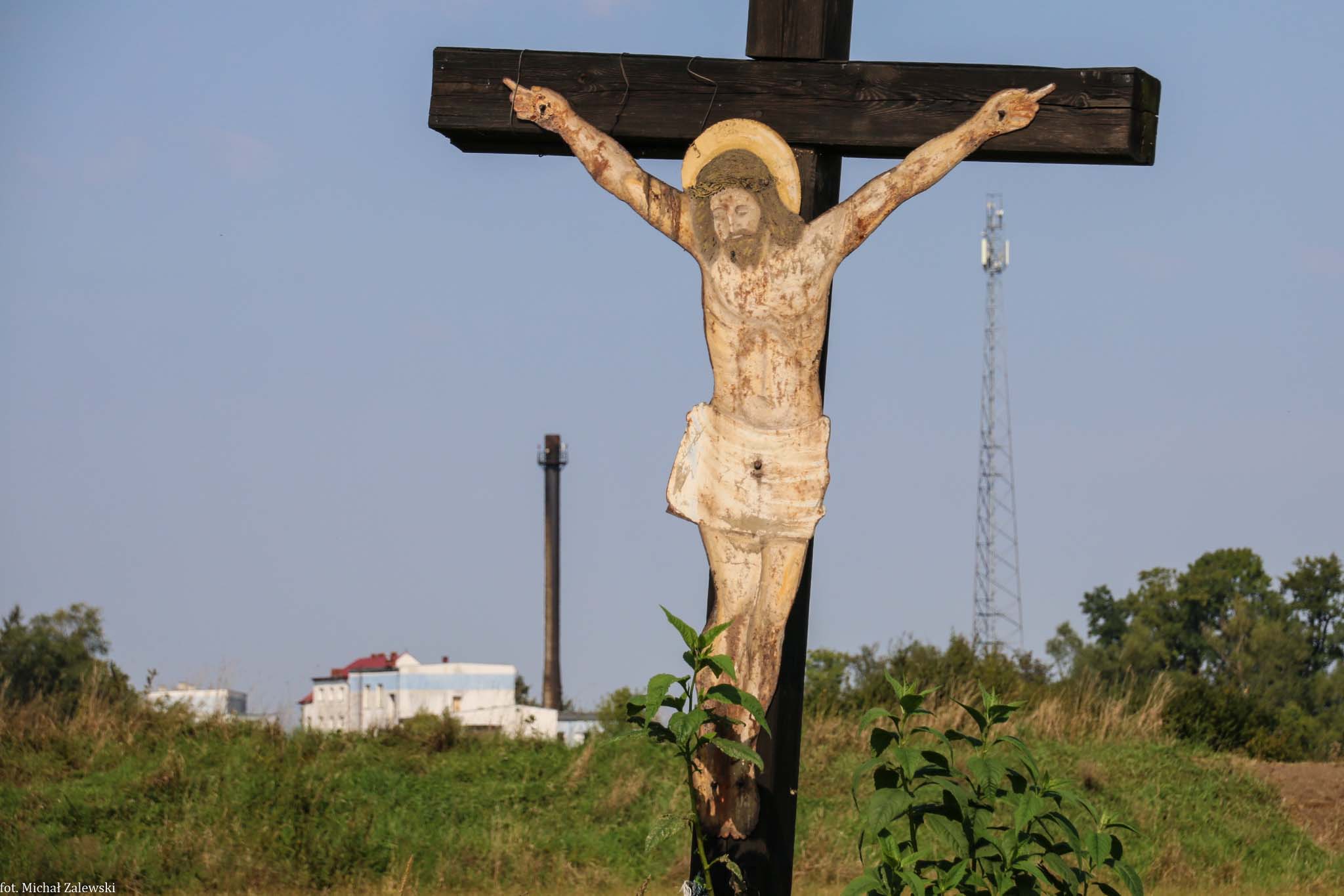 Wiązów (niem. Wansen) pow. strzeliński, woj. dolnośląskie. Przydrożny krzyż z Chrystusem wyciętym z blachy (fot. 2023). W okolicy rzeki Oławy.