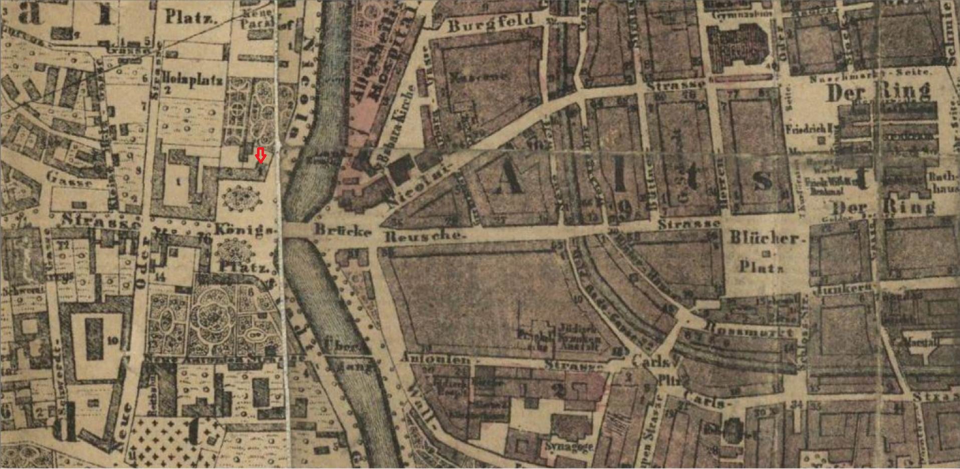 Pl. Jana Pawła II. Königsplatz. Fragment planu Wrocławia z 1863 r. Zaznaczony strzałką kamienny krzyż.