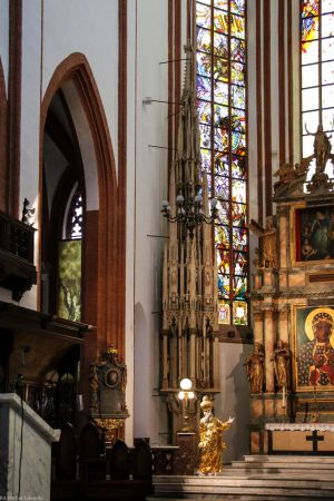 - piaskowcowa chrzcielnica w wspomnianym kościele Najświętszej Marii Panny na Piasku