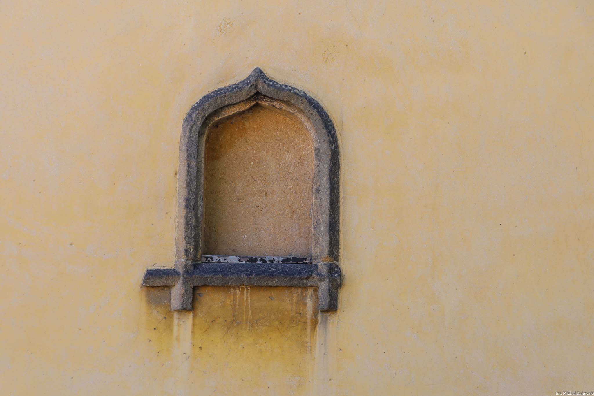 Kowary, kościół  Imienia Najświętszej Maryi Panny, fot. 2024. Okolice północno-zachodniego narożnika. Obiekt podawany nieraz, jako głowica kapliczki.