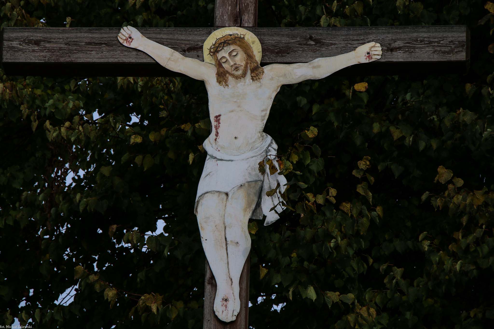 Krzyż z Chrystusem z blachy na cmentarzu w Kujakowicach Górnych, gm. Kluczbork, fot. 2021.