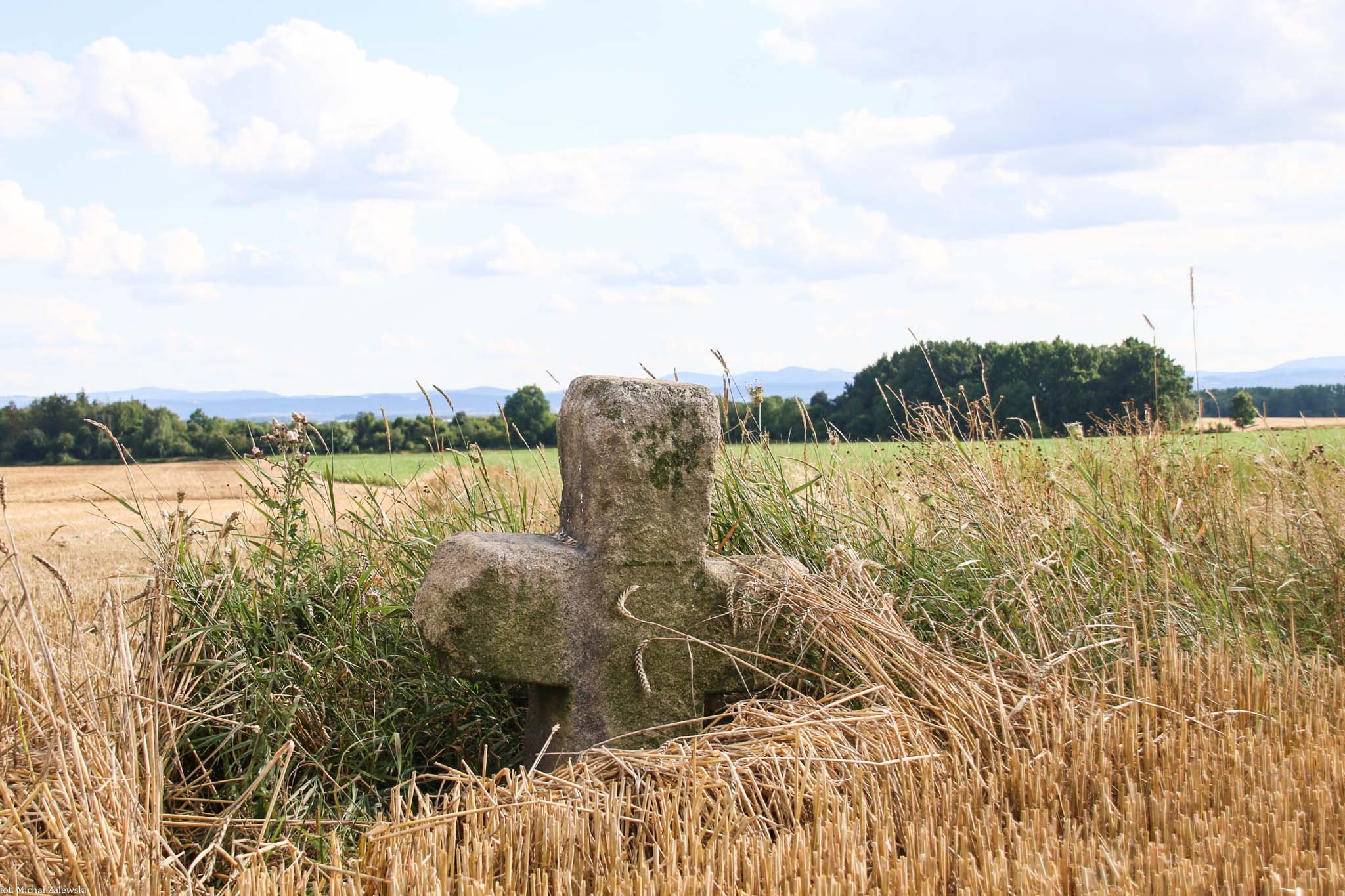 Granitowy krzyż w polu, ok. 1400 m na południe od drogi DK5. 50°58'39.5"N 16°24'57.1"E.