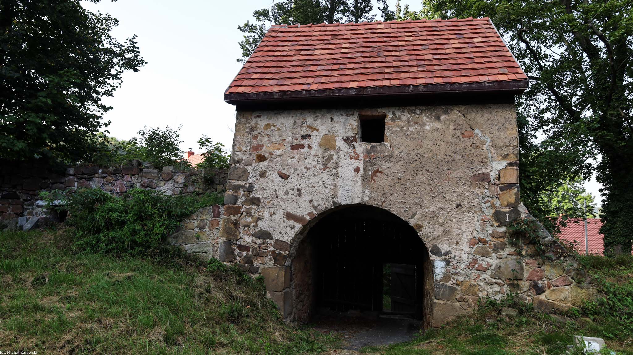 Brama na cmentarz kościelny kościoła pw. Najświętszej Marii Panny (ruiny). W wejściu z lewej kamień z rytem miecza. | Brama na cmentarz kościelny kościoła pw. Najświętszej Marii Panny (ruiny). W wejściu z lewej kamień z rytem miecza. | ||