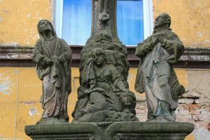 Stojący do niedawna na wschodnim krańcu wsi, przy rozjeździe dróg na Kąty Wrocławskie i Wszemiłowice, drewniany krzyż różnił się od pozostałych brakiem charakterystycznego daszku nad Chrystusem. Blaszana postać Ukrzyżowanego była na nim większa, a niżej znajdowała się, również wycięta z blachy, Matka Boska Bolesna przebita siedmioma mieczami boleści (fot. 9). W jego miejsce postawiono nowoczesny krzyż murowany (fot. 10) identyczny jak przy drodze do Chmielowa, ale z figurą Ukrzyżowanego.