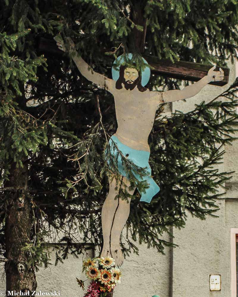 Glinica (niem. Gleinitz ) gm. Jordanów Śląski, pow. wrocławski, woj. dolnośląskie. Krzyż przydrożny z Jezusem wyciętym z blachy (fot. 2012).