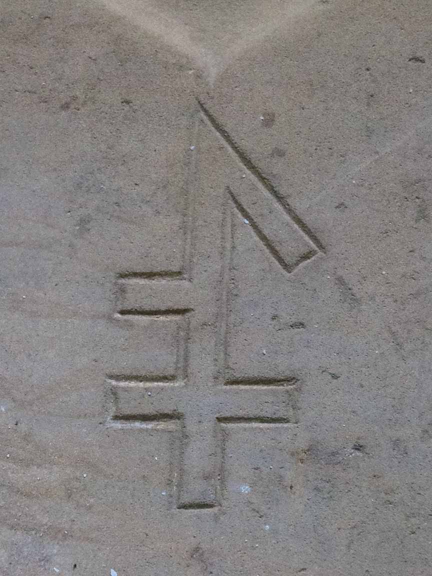 Niezidentyfikowany herb (gmerk, Hausmarke) na płycie nagrobnej Petera Rothe zm. 1464 (Płyta nagrobna Piotra Rothe młodszego) w kaplicy rodziny Heugel w farze elżbietańskiej we Wrocławiu.