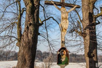 Krosnowice (niem. Rengersdorf) gm. Kłodzko, pow. kłodzki, krzyż z Chrystusem wyciętym z blachy. Pod Chrystusem Marka Boska Bolesna (fot. 2023).