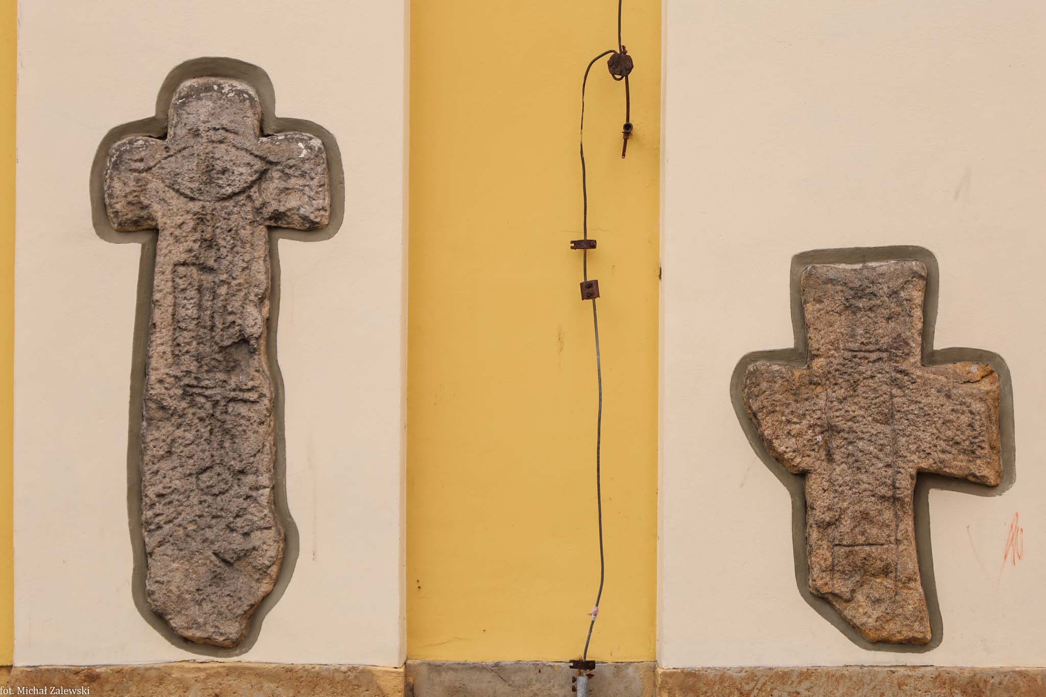 Dwa krzyże wmurowane w północną ścianę kościoła, aktualnie prawosławnego, śś. Apostołów Piotra i Pawła przy ul. 1 Maja.