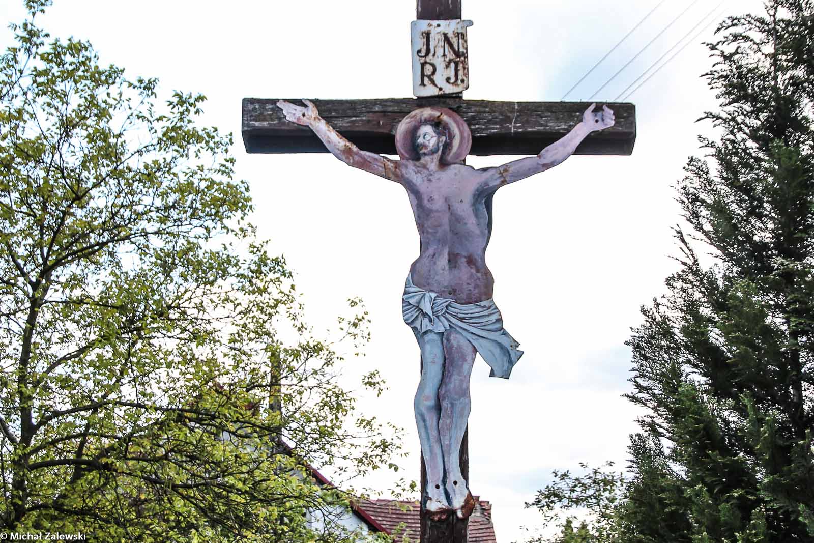 Tymowa, wcześniej Thiemendorf, gm. Ścinawa, powiat lubiński, drewniany przydrożny krzyż z Chrystusem wyciętym z blachy, fot. 2019