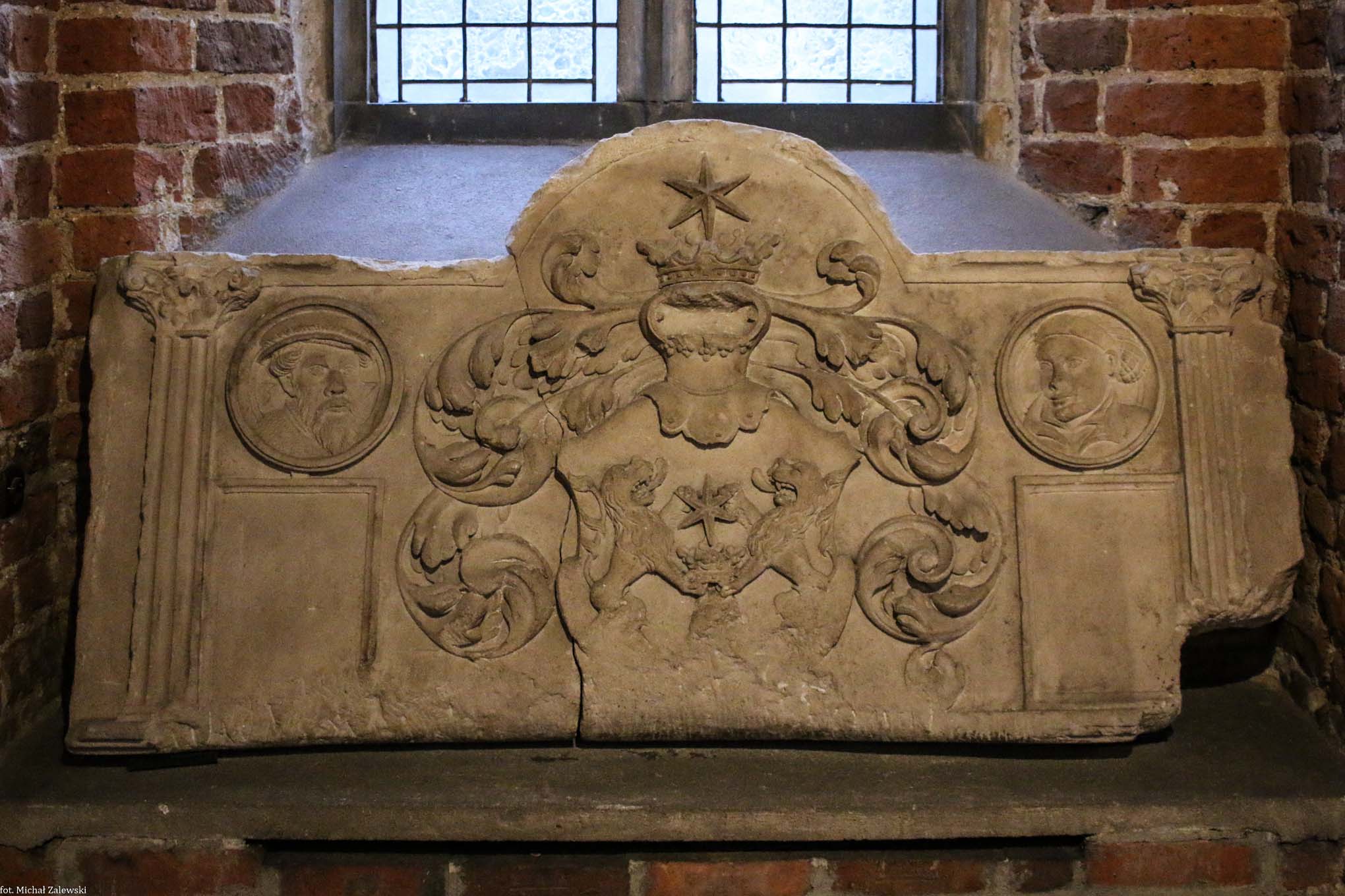 Zwieńczenie portalu kamienicy przy ul. Wita Stwosza 14 we Wrocławiu (1537 r.). Herb i portrety fundatorów. Muzeum Architektury.