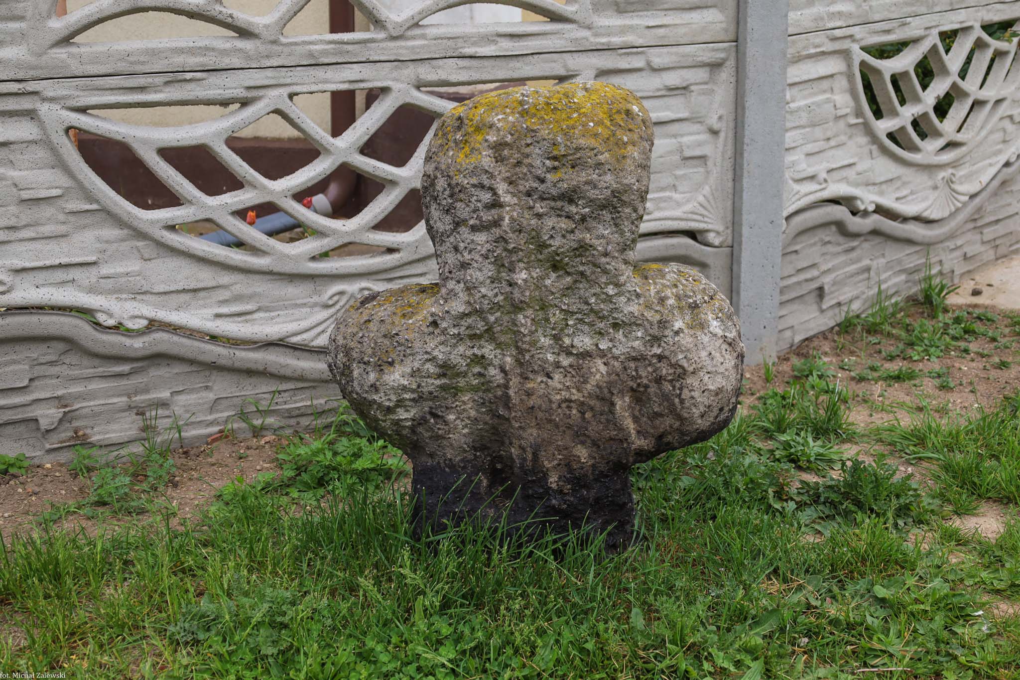 Piaskowcowy krzyż po WN stronie skrzyżowania ulic Kraszewskiego i Kościelnej, przed ogrodzeniem domu nr 4 (51°33'03.7"N 15°32'57.4"E).