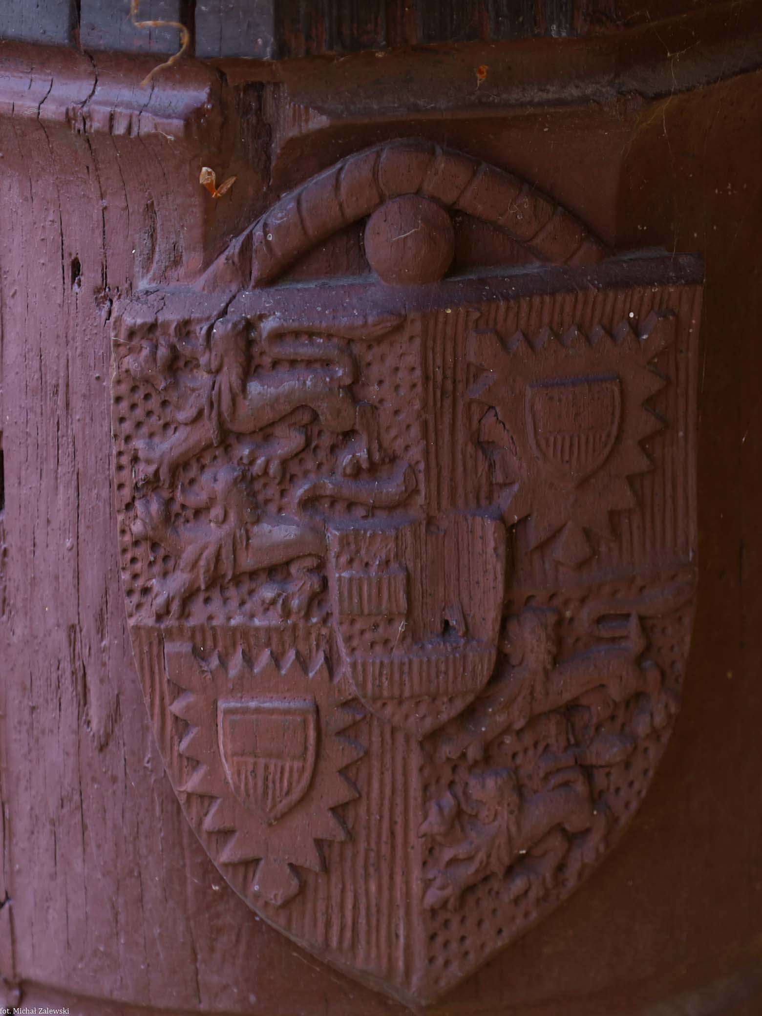 Przemków. Na byłym kościele ewangelickim, a współcześnie cerkwi św. Michała Archanioła w Przemkowie, wisi drewniana płaskorzeźba, powstała w 1916 r. w intencji podtrzymania ducha wojennego mieszkańców miasta. Fot. 2024.