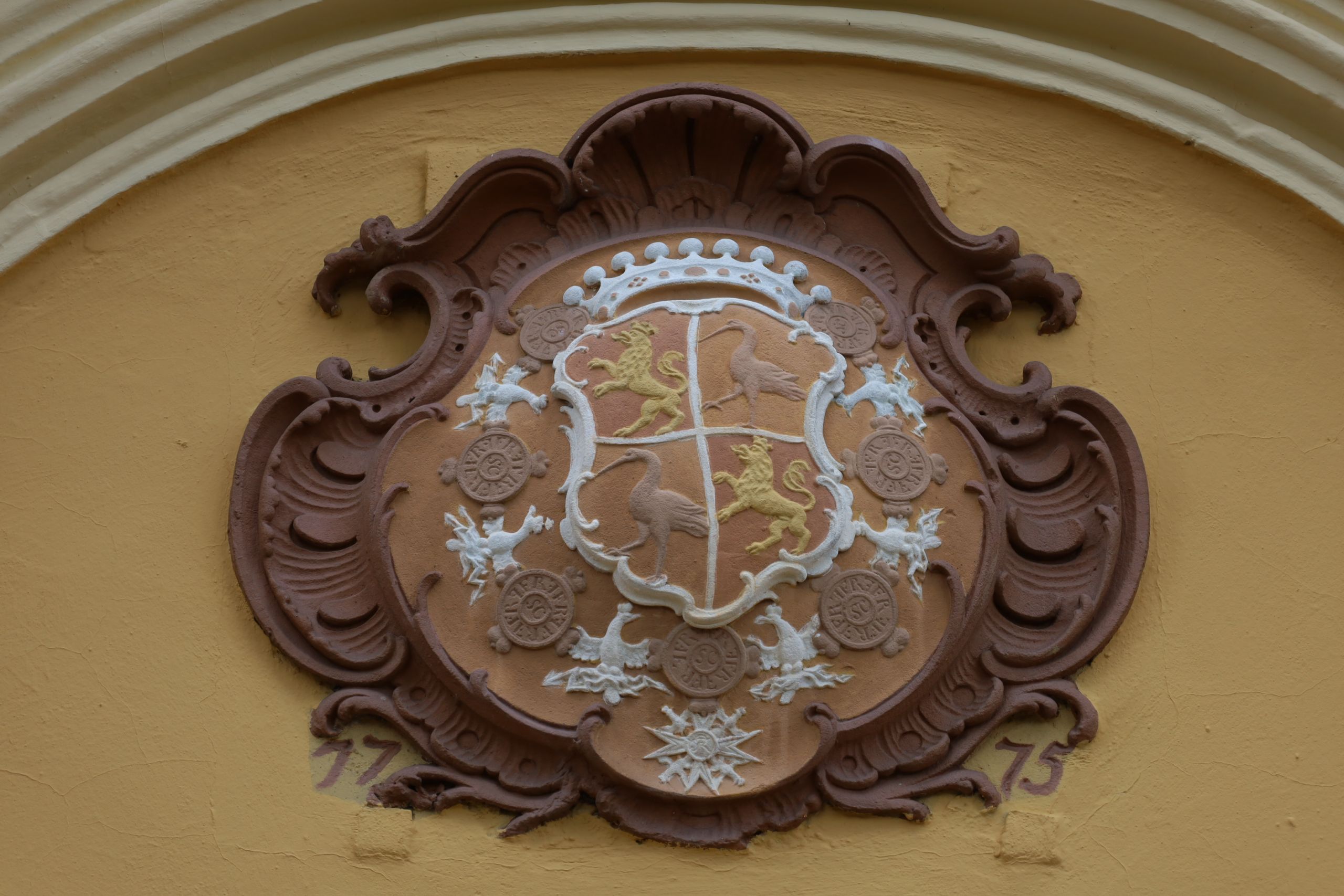 Herb rodziny von Schleswig-Holstein, gałęzi Szlezwik-Holsztyn-Sonderburg-Augustenburg, nad portalem wejściowym przez wieżę. Herb związany z wybudowaniem strzelistej wieży w latach 1871–1872. Sam kościół powstał w latach 1744–1746.
