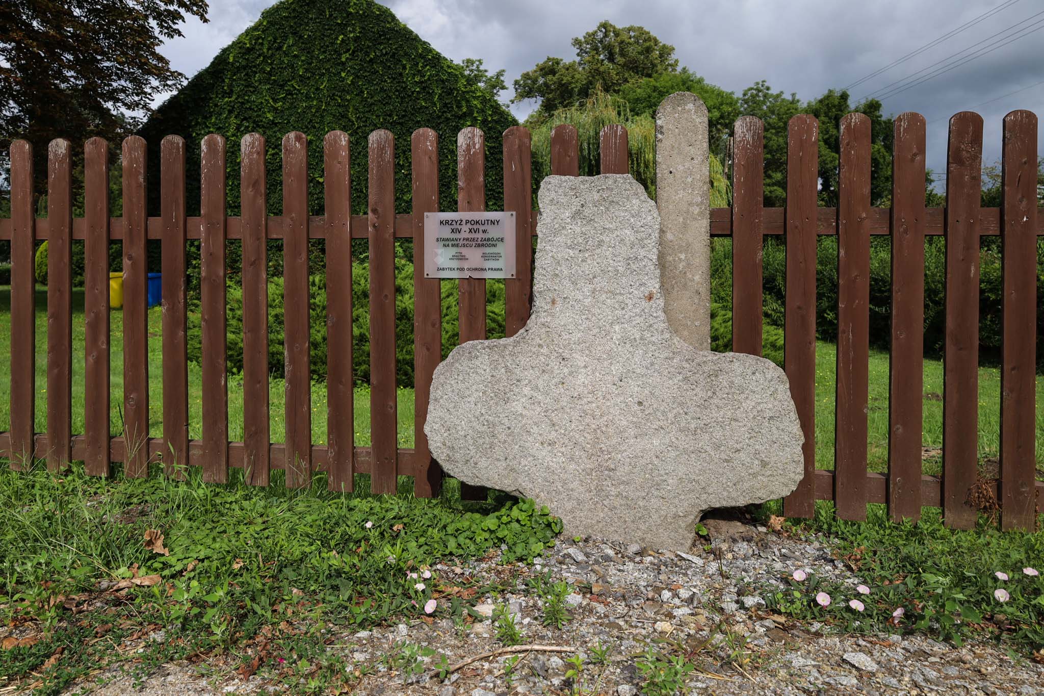 Granitowy krzyż ustawiony pod płotem po zachodniej stronie głównej drogi (naprzeciwko posesja nr 69), niedaleko kościoła (51°01'14.2"N 17°34'05.5"E). Krzyż ma uszkodzone ramiona. Wymiary: 103×107×14 cm.